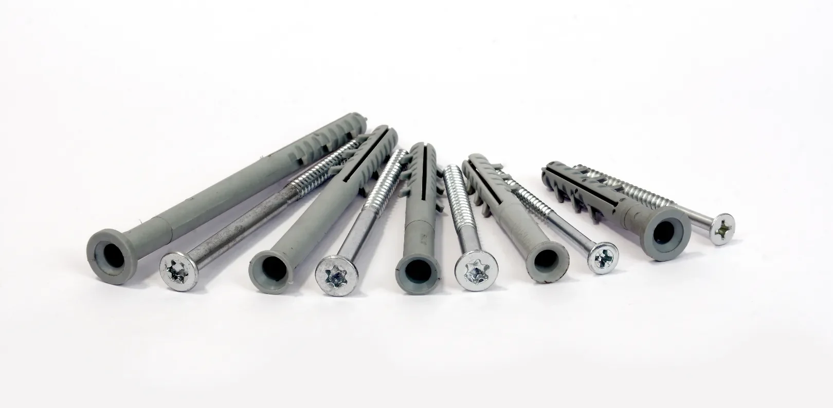 Special grade nylon anchors (6×30 to 10×160) paired with steel grade 4.8 screws (Ø 3.8–7mm, 60–150mm), in CSK and flat head configurations. Reliable fastening for electrical, plumbing, interior, and light construction — every time.